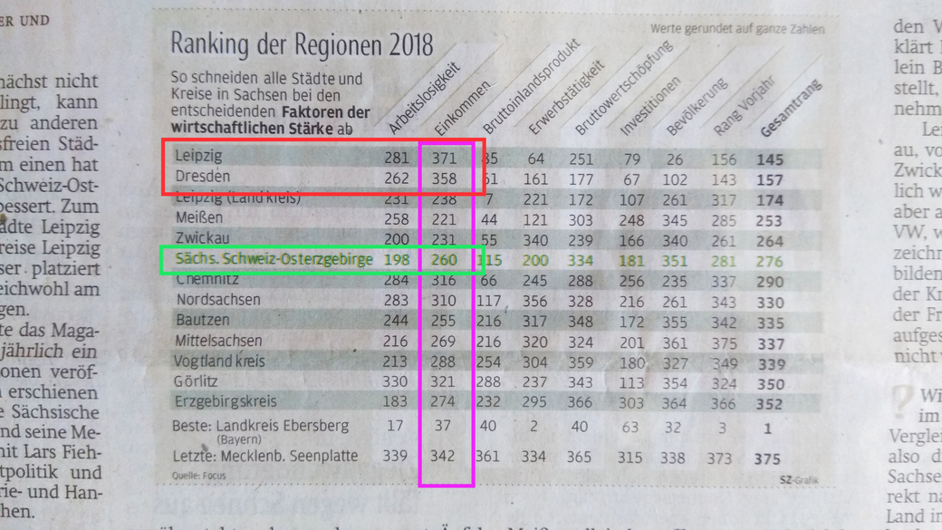 In dem Artikel ist eine Tabelle mit einem Vergleich der Regionen in Sachsen. Unter anderem werden das Einkommen und die Arbeitslosigkeit verglichen.