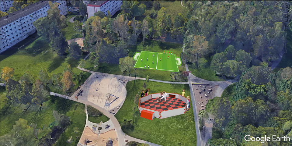 Ab Schuljahresbeginn 2019 können sich die Kinder und Jugendlichen in Copitz-West über zwei neue Attraktionen zur sinnvollen Freizeitgestaltung freuen. Auf dem Spielplatz am Hort wird ein Panna Soccer Court errichtet und für ein zweites Fussballfeld werden zwei Tore aufgebaut. Die Abbildung zeigt die bevorzugten Standorte.