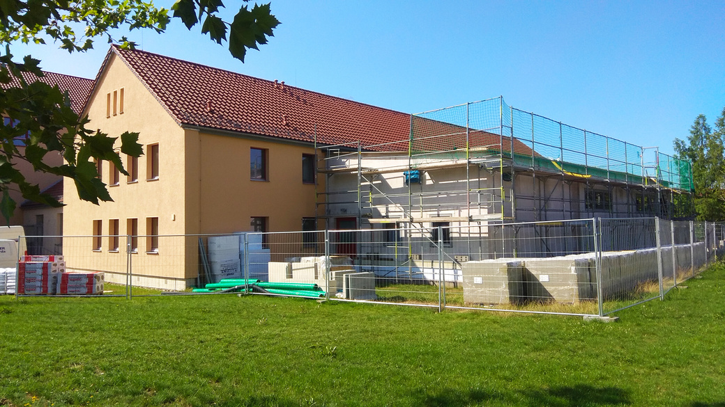 Die Übergabe des Fördermittelbescheides war verbunden mit einer Besichtigungstour durch das Gebäude, in dem die Sanierungsarbeiten noch im vollen Gange sind. Das freigelenkte Gebäude wird seit nunmehr einem Jahr umfassend grundsaniert und modernisiert. Auch die technische Ausstattung wird auf den neuesten Stand der Technik gebracht. Auf der Aussenanlage wird ein multifunktionaller Ballsportplatz mit 5 m hohen Ballfangnetzen errichtet.
