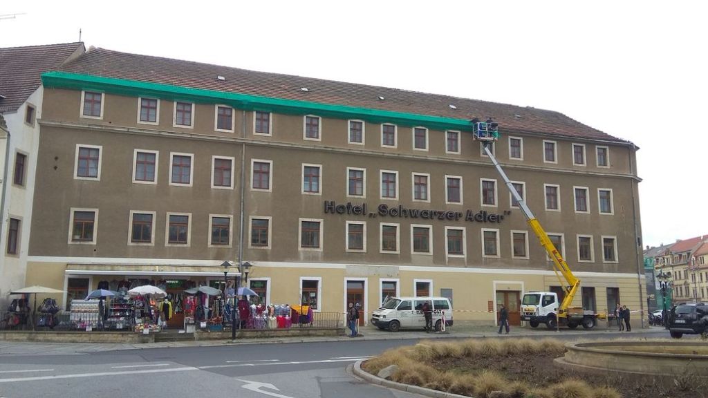 Seit dem heutigen Montag Vormittag werden am ehemaligen Hotel Schwarzer Adler Notsicherungsmaßnahmen gegen herabstürzende Ziegel durchgeführt. Bisher hat die Dachrinne wohl Schlimmeres verhindert.