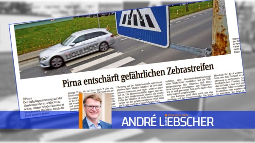 Wie die Sächsische Zeitung berichtet, plant die Stadt Pirna den unfallträchtigen Fußgängerschutzweg in der Einsteinstraße auf Höhe des Seniorenheims bis zum Frühjahr 2020 mittels einer Bedarfsampel zu entschärfen. Erst am 22.11.2019 wurde morgens kurz vor 6.00 Uhr eine Elfjährige auf dem Zebrastreifen angefahren und schwer verletzt.