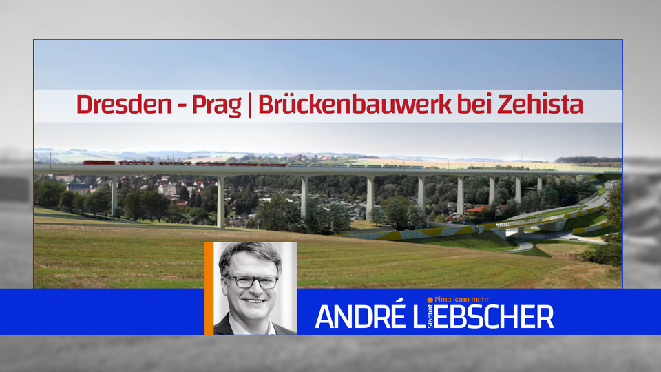 2045 soll sie fertig sein, die Schnellfahrstrecke Dresden-Prag. Für eine Streckenführungsvariante müsste über das Seidewitztal in Zehista neben der Brücke der Südumfahrung ein 40 m hohes Brückenmonstrum entstehen, auf dem dann ab 2045 aller 5 Minuten ein Zug über die Köpfe der Pirnaer donnert. Sehen Sie dazu ein Bildschirmfoto aus der weiter unter verlinkten Streckensimulation.