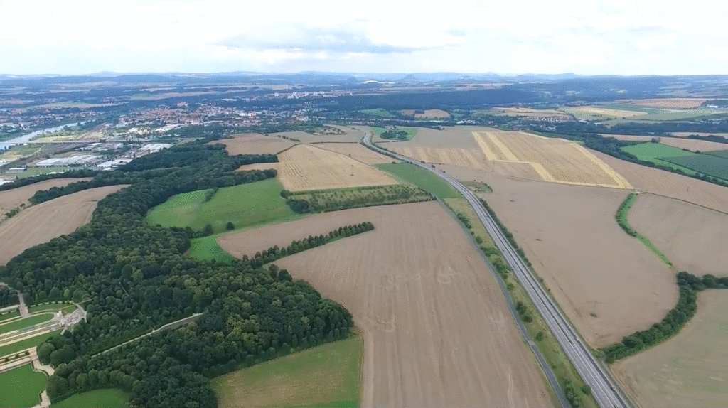 Die Animation zeigt einen Teil des Feistenbergs, links unten der Barockgarten, im Hintergrund Pirna. Die rot eingezeichnete Fläche stellt das IPO-Zweckverbandsgebiet dar.