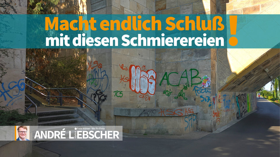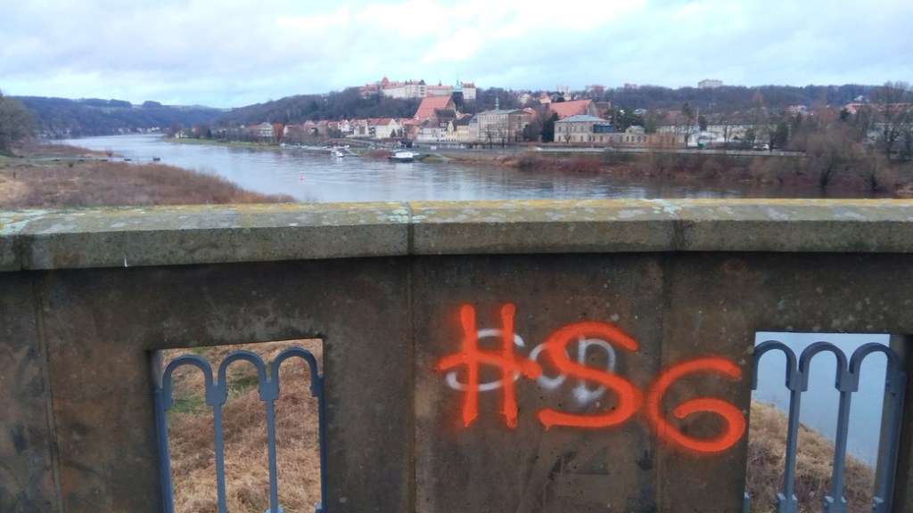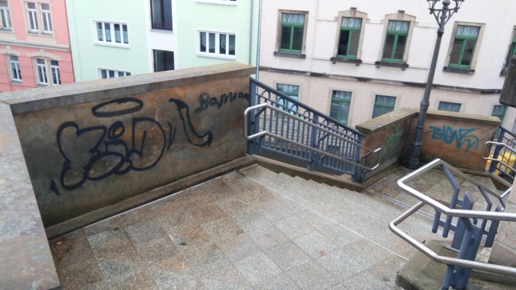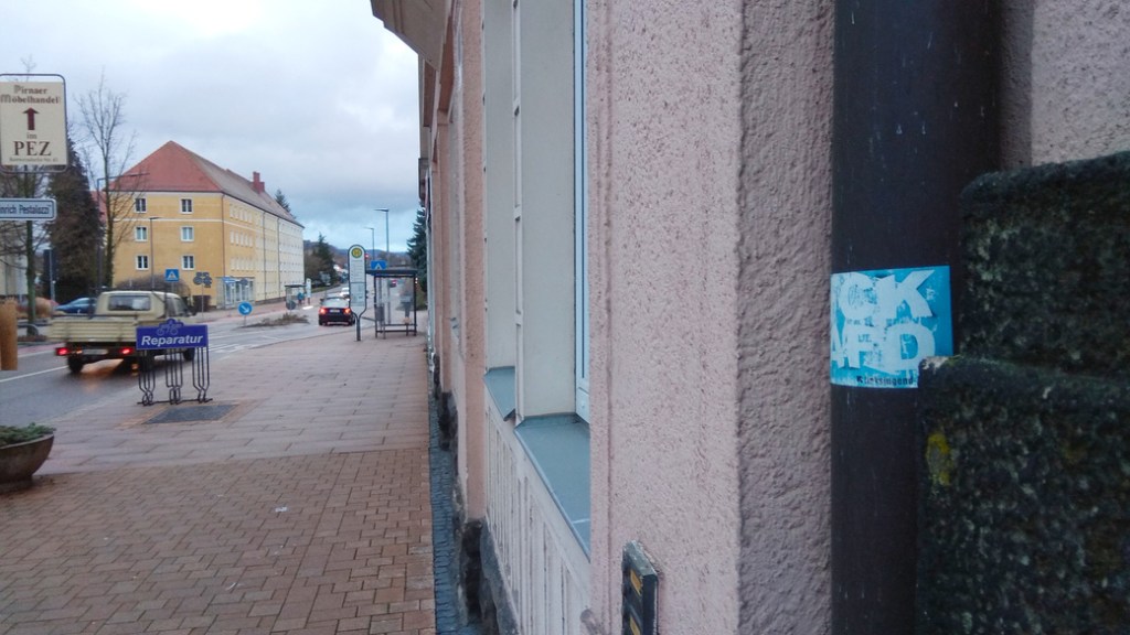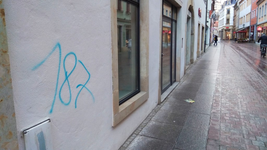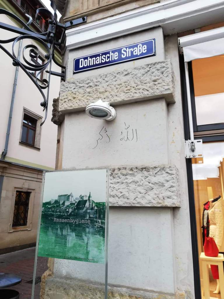 Dies sind nicht die einzigen Sachbeschädigungen. Was man so alles in Pirna auf dem Fußweg von Copitz über die Gartenstraße zum Marktplatz entdecken kann, habe ich im Bild festgehalten. Alle Bilder stammen aus der Zeit, als die arabischen Schriftzeichen im Februar 2020 das erste Mal auftauchten bis August 2020.