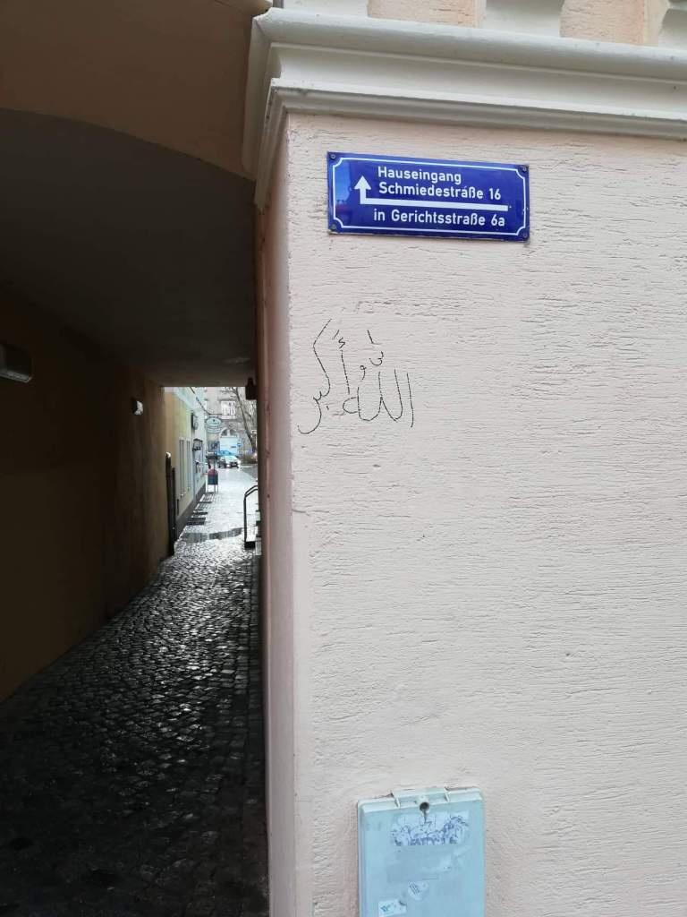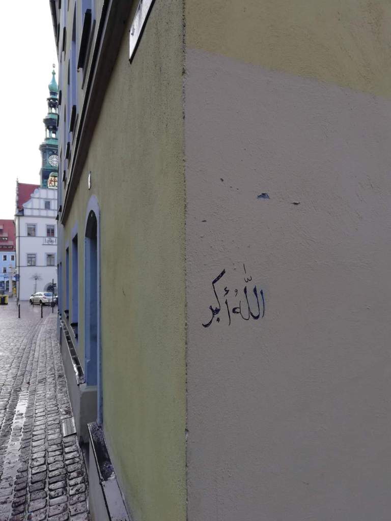 In Pirna sind Anfang diesen Jahres arabische Schriftzeichen an und in Häusern entdeckt wurden, deren Bedeutung ins Deutsche übersetzt wortwörtlich „Gott ist größer“, „Gott ist der Größte“, „Gott ist der Großartigste“ oder „Gott ist am größten“ bedeuten. Unter anderem berichtete der Wochenkurier zu diesem Thema.