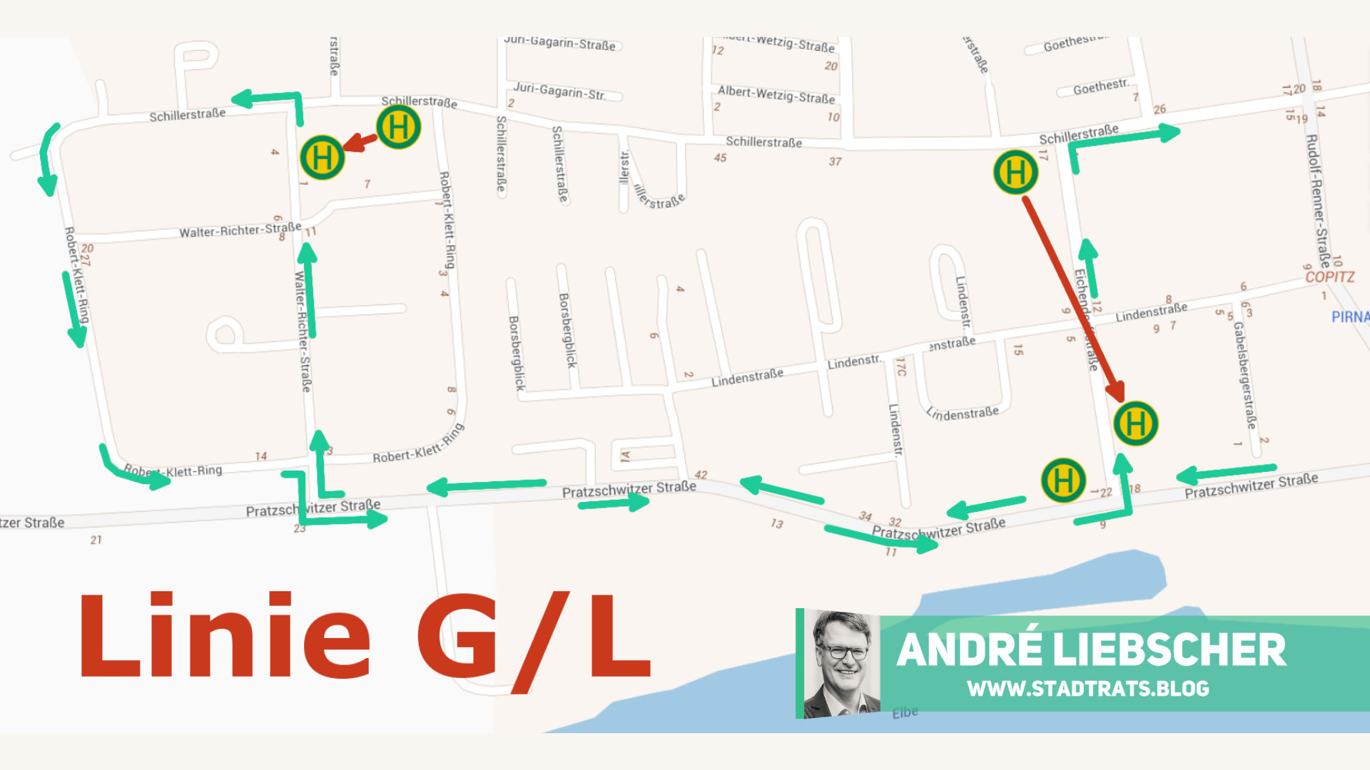 Die Linien G/L, 246 werden ab Walter-Richter-Straße über Schillerstraße, Robert-Klett-Ring, Pratzschwitzer Straße, Eichendorffstraße, Lindenstraße und Rudolf-Renner-Straße umgeleitet.