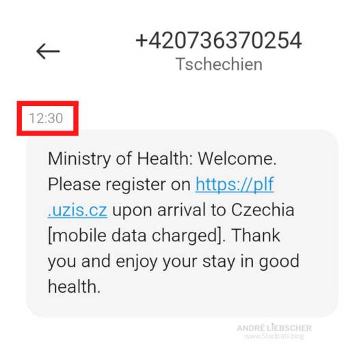 Bei der Einreise zum Beispiel in Tschechien erhält man ebenso eine Info-SMS, und zwar in diesem Fall des tschechischen Gesundheitsministeriums zu den Corona-Regeln in Tschechien.