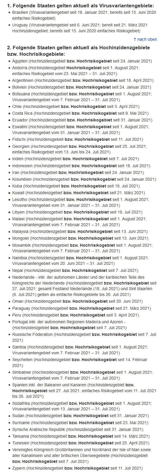 Achtung! Aufzählung vom 1. August 2021. Bitte informieren Sie sich tagesaktuell!