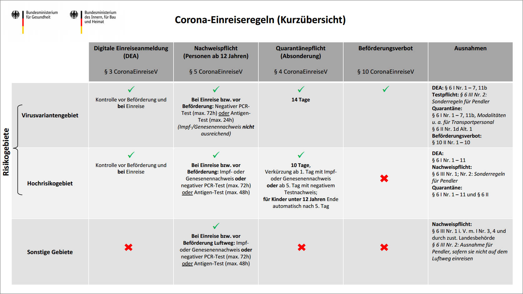 Einreiseanmeldung | Einreisende, die sich in den letzten zehn Tagen vor der Einreise in einem zum geplanten Zeitpunkt der Einreise als Hochrisiko- oder Virusvariantengebiet eingestuften Gebiet aufhalten, müssen sich vor ihrer Einreise über das Einreiseportal registrieren. Auch Test-, Impf- oder Genesenennachweise sind dort hochzuladen, sobald man sie hat.