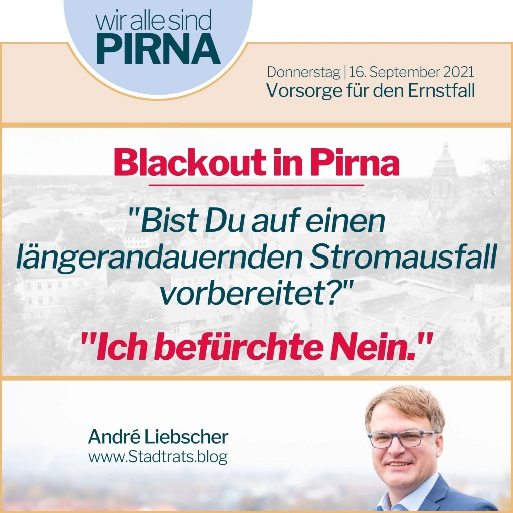 Während das Landratsamt bereits Vorkehrungen festgelegt und Notfallpläne für einen 7 Tage anhaltenden Stromausfall entwickelt hat, weiß ich aus Gesprächen der letzten Tage, dass die wenigsten Pirnaer keine oder unzureichende Vorsorge für ein derartig massives Schadensereignis getroffen haben.