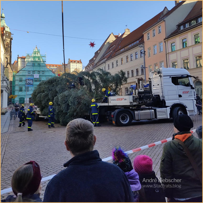 Heute Nachmittag 14.18 Uhr rollte er bei strahlenden Sonnenschein und den Augen zahlreicher Schaulustiger auf dem Marktplatz ein – Pirnas Weihnachtsbaum. Zuvor hatte der THW Ortsverband Pirna den Baum in der Graupaer Lohengrinstraße gefällt und sicher durch unser Pirna gebracht.