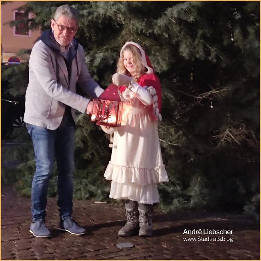 Pirnas diesjähriges Weihnachtskind, die zehnjährige Thea aus Pratzschwitz hat heute Nachmittag den Strom für die Beleuchtung angeschaltet. Sie bekam dabei Unterstützung von Oberbürgermeister Klaus-Peter Hanke und von Holger Zastrow, der mit der Plan de Saxe GmbH den Canalettomarkt geplant hatte.