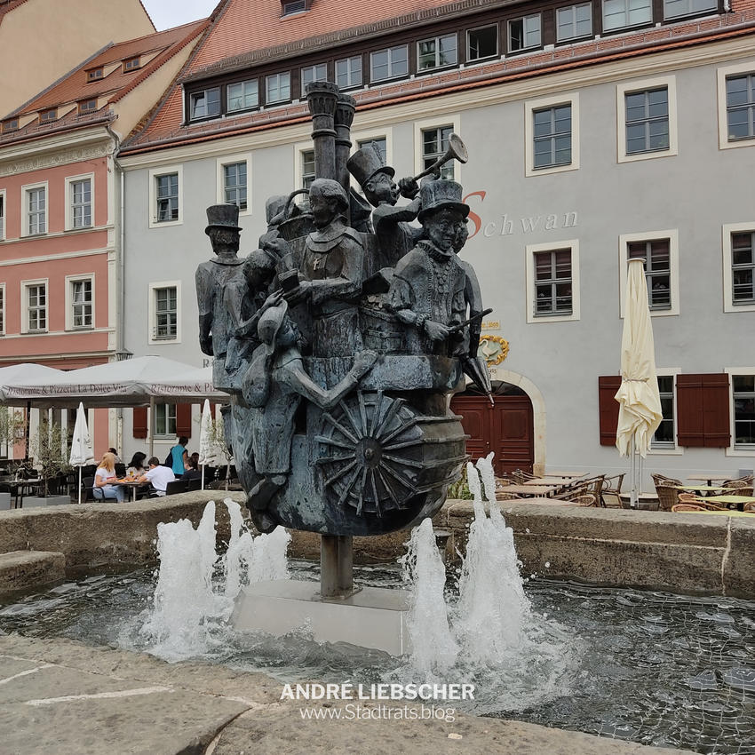Den Brunnen auf dem Untermarkt in Pirna ziert nun seit 2016 ein bunt gemischtes Figurenensemble. Ob ein Trompeter, ein Erzbischof, der Ablasshändler Johannes Tetzel oder der Bürgermeister Volckamer – der Künstler Jan Witte-Kropius ließ sich inspirieren durch das Buch „Pirnaer Sagen und Geschichten“ – zusammengestellt und im Eigenverlag von Justizrat Dr. Richard Flachs im Jahr 1918 herausgegeben.