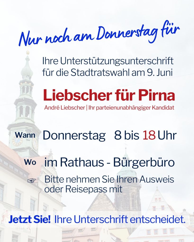 Die Teilnahme als parteienunabhängiger Bürgerkandidat an der Wahl im Juni ist in den vergangenen vier Wochen Dank der Unterstützung zahlreicher Pirnaerinnen und Pirnaer in greifbare Nähe gerückt.